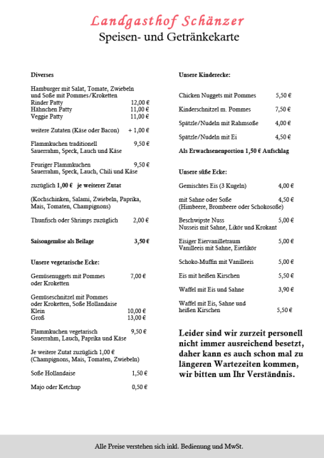 Wählen Sie aus ausgewählten Speisen der vielfältigen deutschen Küche und lassen Sie sich begeistern. Probieren Sie die regionalen Gerichte, die täglich mit Liebe von unserem Koch kreiert werden. Auch bei unserer großen Getränkeauswahl setzen wir auf Frische und Genuss!