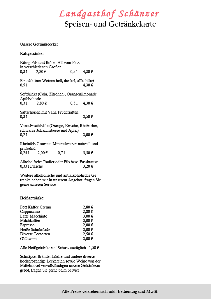 Wählen Sie aus ausgewählten Speisen der vielfältigen deutschen Küche und lassen Sie sich begeistern. Probieren Sie die regionalen Gerichte, die täglich mit Liebe von unserem Koch kreiert werden. Auch bei unserer großen Getränkeauswahl setzen wir auf Frische und Genuss!