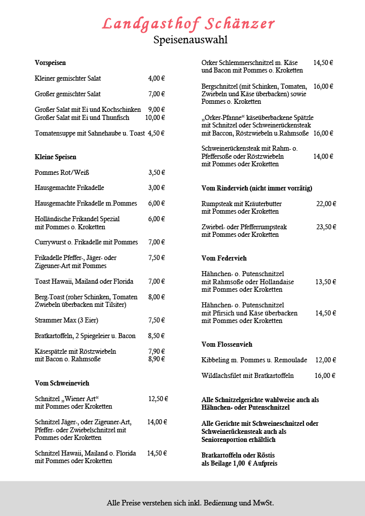 Ob in der urigen Kneipe oder im sonnigen Biergarten – genießen Sie gutbürgerliche Gerichte wie Schnitzel, Flammkuchen oder unsere beliebte „Orker Pfanne“, begleitet von frisch gezapftem Bier, beliebten Softdrinks, erlesenen Weinen oder aromatischen Kaffeespezialitäten.